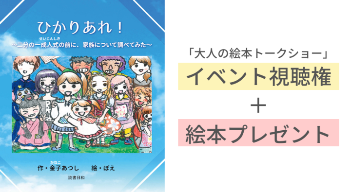 内容:絵本「ひかりあれ!~二分の一成人式の前に家族について調べてみた~」朗読、作者&編集者トークショー